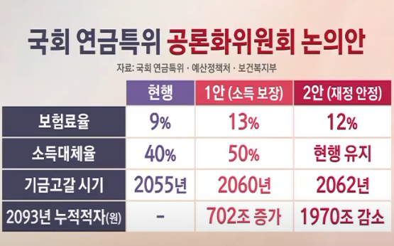 소득의 9%에서 13%로 올리고 소득대체율은 40%에서 50%로 올리는 방안을 채택했습니다. 소득대체율이 10%로 더 높이는 것은 보험고갈시점이 늦어지지만 기금은 결국 고갈이 됩니다. 미적립 연금충당부채가 어마하게 늘어나서 개혁이 아니라 미봉책에 불과하다는 주장이 많습니다.